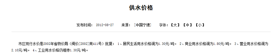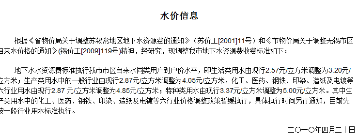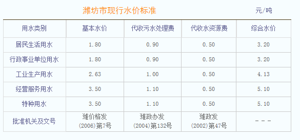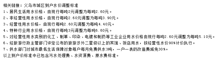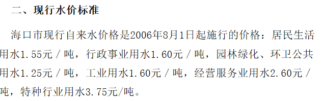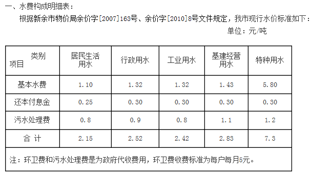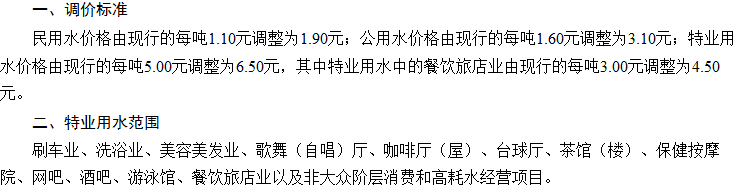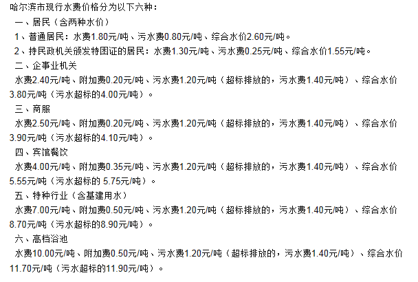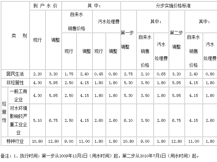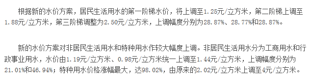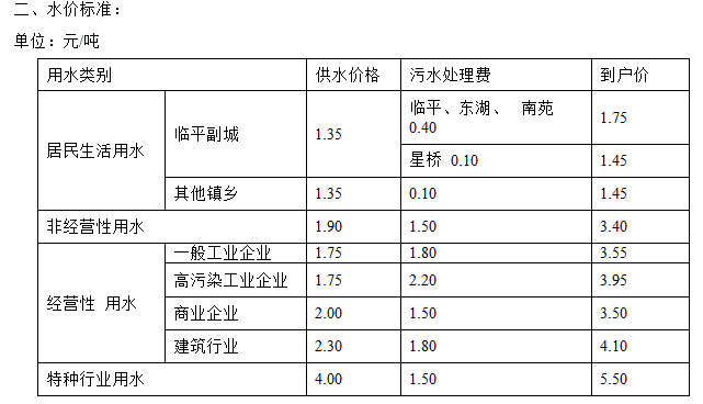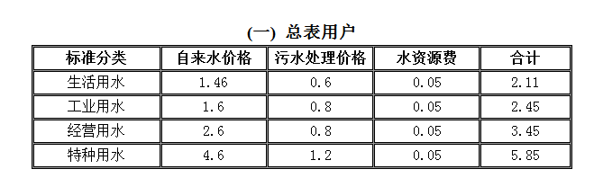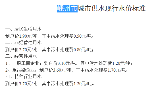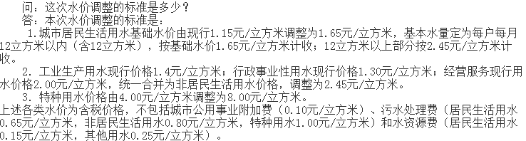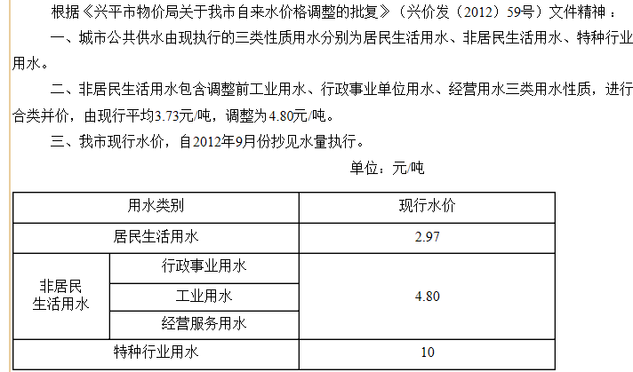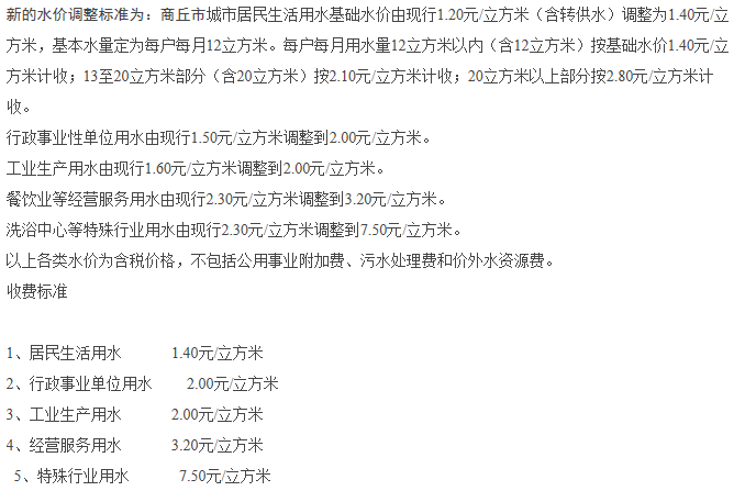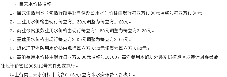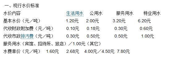 非居民用水:行政事业单位为2.6元每立方米;工业用水为1.745元每立方米;经营服务业用水为2.元每立方米;特种用水9元每立方米。以上价格包括水资源费和污水处理费,非居民生活用水在基本水价基础上分别加收0.04-0.05元/立方米城市附加费。