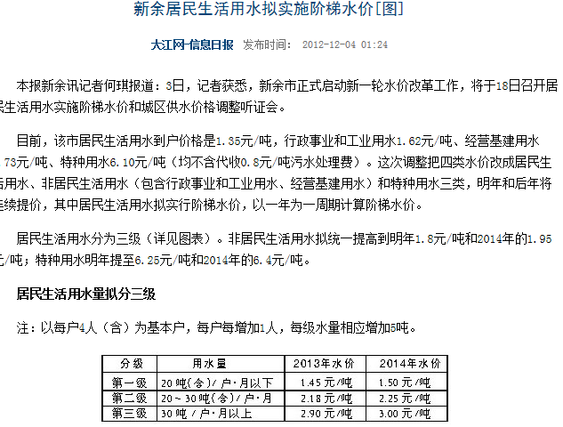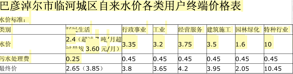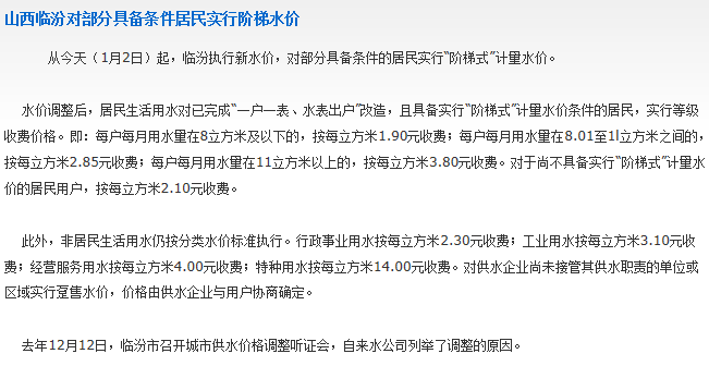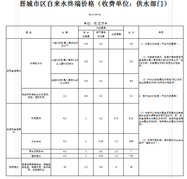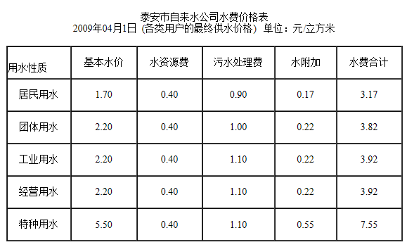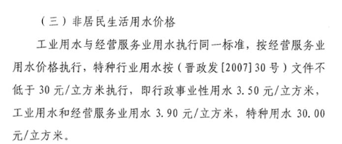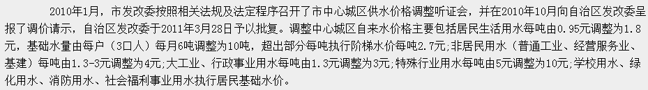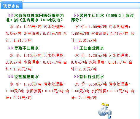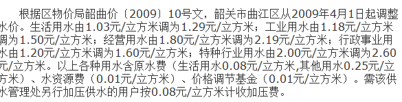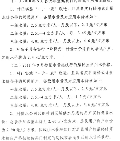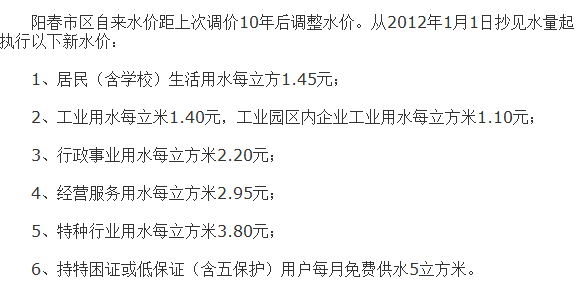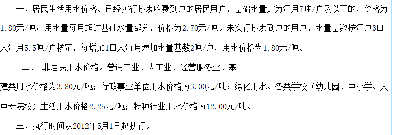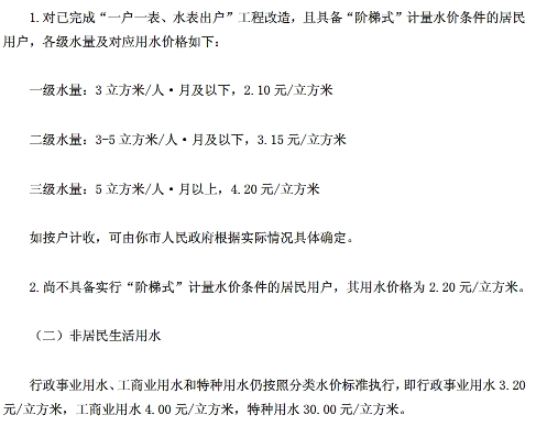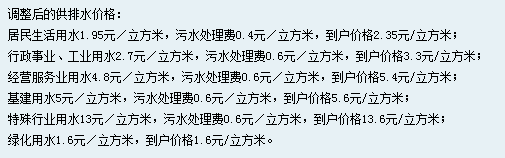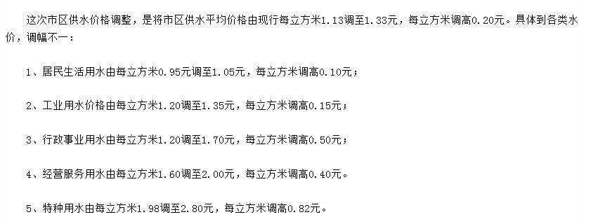 二、销售价格:居民生活用水由现行0.95元/立方米调整为1.20元/立方米;工业和行政事业用水由1.09元/立方米调整为1.30元/立方米;经营服务用水由1.44元/立方米调整为1.60元/立方米;特种用水由1.64元/立方米调整为1.90元/立方米。上述基本水价中含市政府价格调节基金0.02元/立方米。