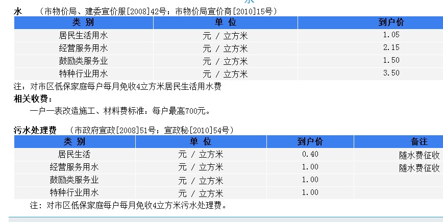 三、基本水价调整后,原在价外征收的城市附加费仍按原标准执行,即:工业用水和行政用水0.08元/立方米,经营服务用水0.11元/立方米 ,特种用水0.12元/立方米,居民生活用水不收城市附加费。