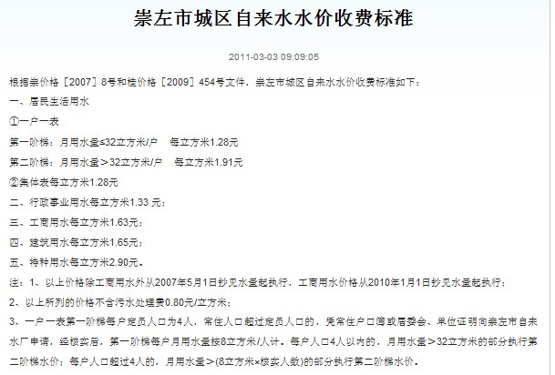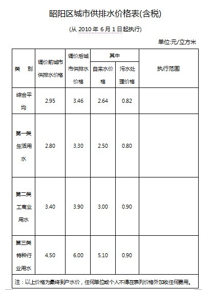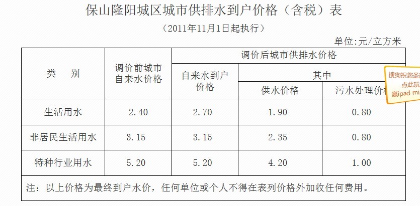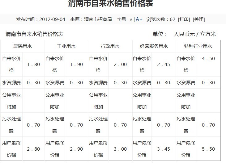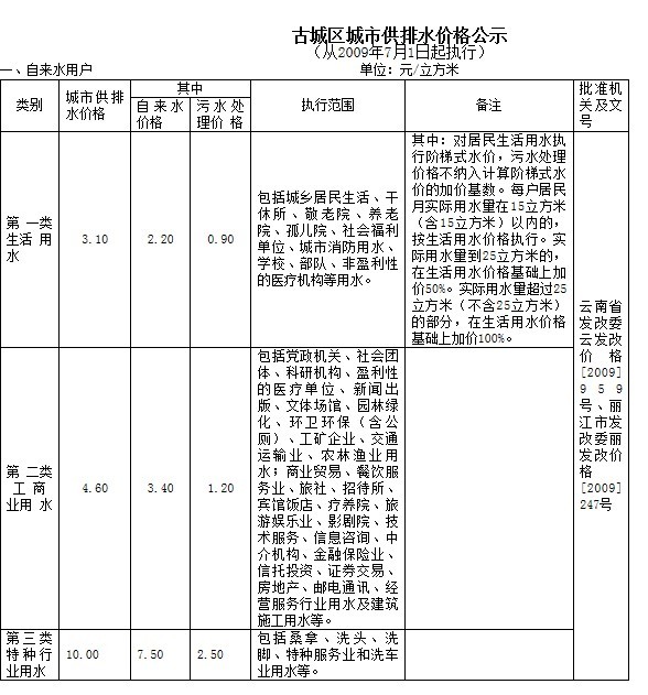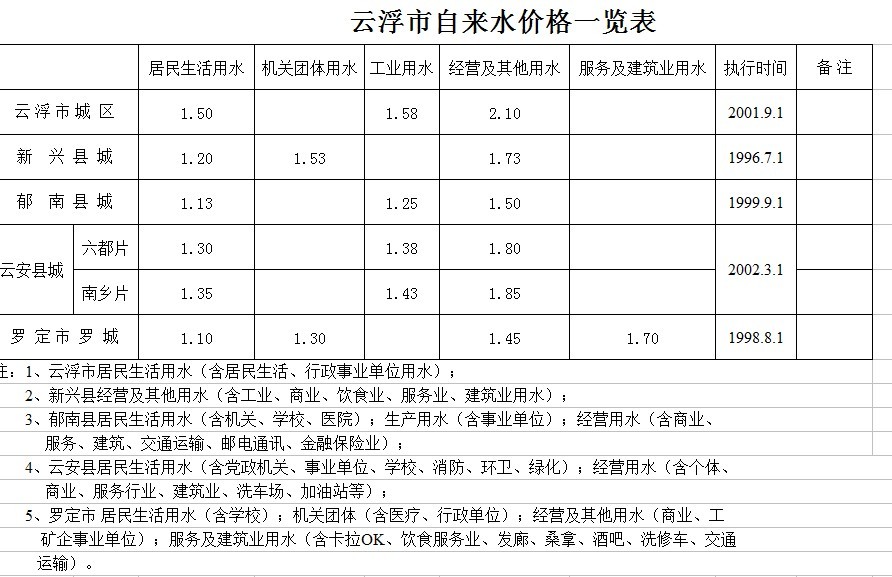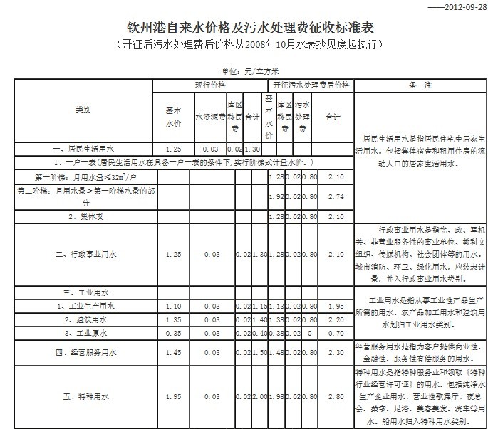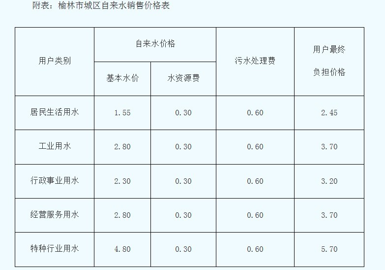 4类用水每立方米分别为:行政事业单位用水1.50元、工业用水1.65元、经营服务用水2.35元、特种行业用水4.80元。