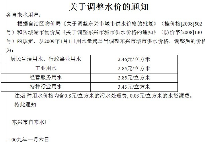 每立方米水价 1.10元 1.65元 2.20元