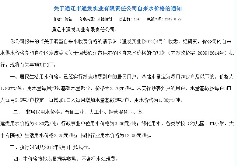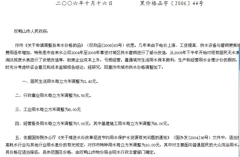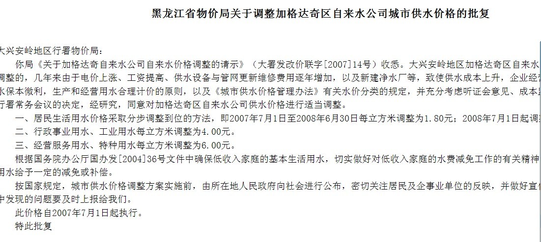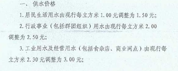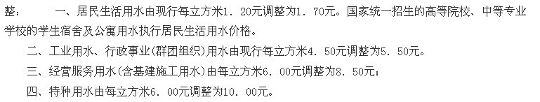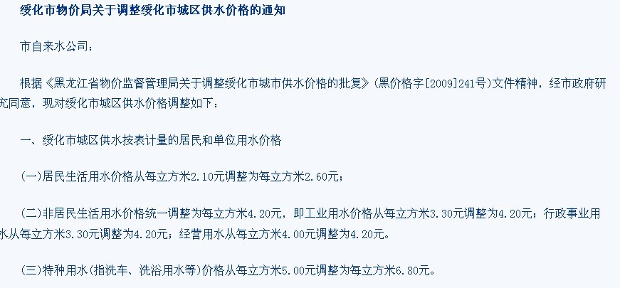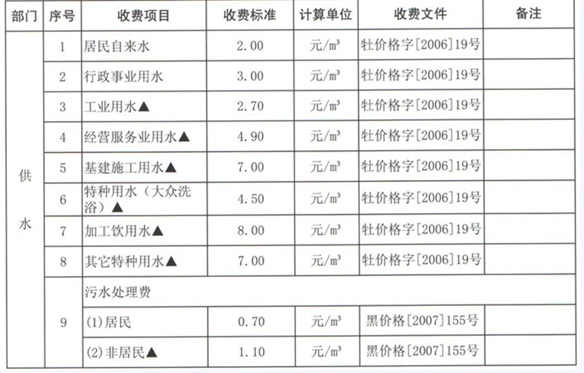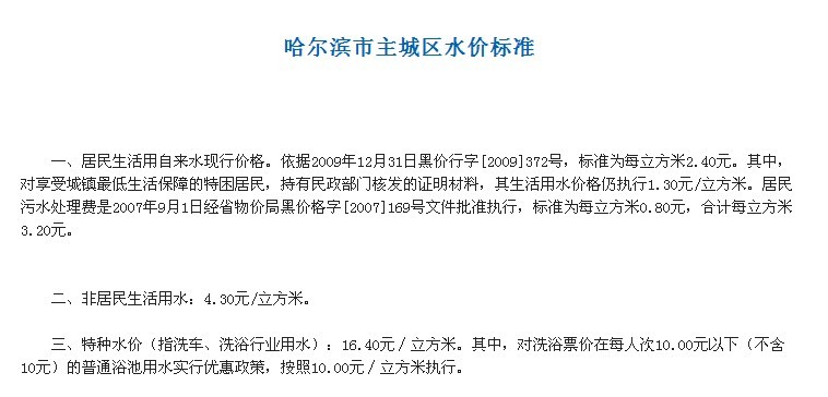 Trac-King 发表于 2012-12-16 17:23 黑龙江佳木斯市 居民生活用水1.40元/平方米,工业、行政事业单位用水2.00元/平方米,经营服务业用水2.20元 ...