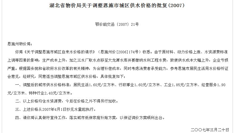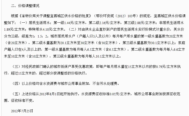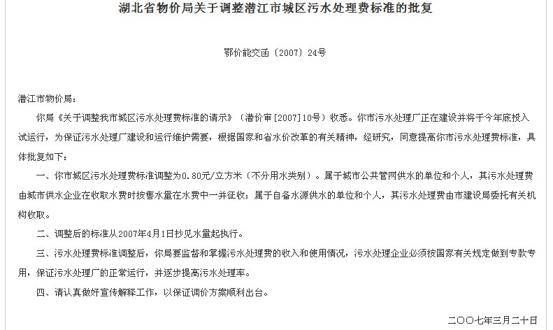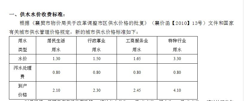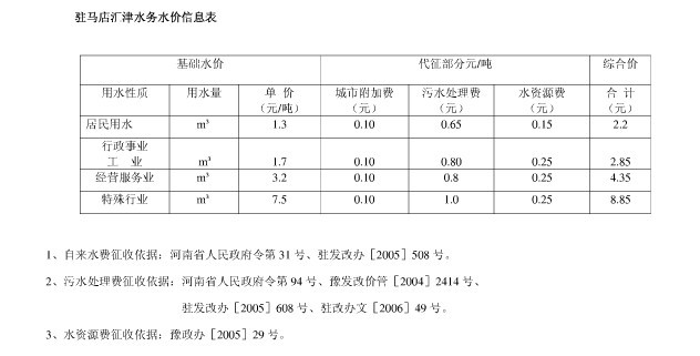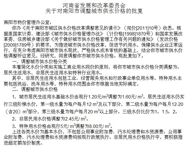 近日(2012年),南阳市出台《中心城区城市污水处理费征收管理工作实施细则》,明确了居民、单位的污水处理费征收标准,其中城区居民生活用水为每立方米0.65元。