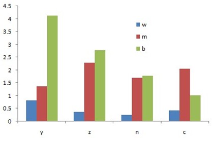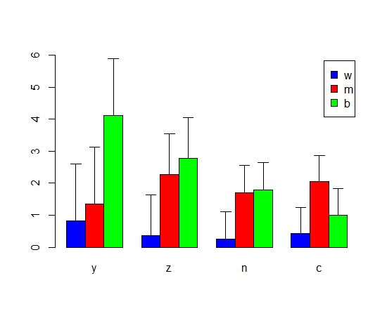bp <- barplot(dat, beside = T, col=c("blue","red","green"), legend = rownames(dat), ylim=c(0, 6))