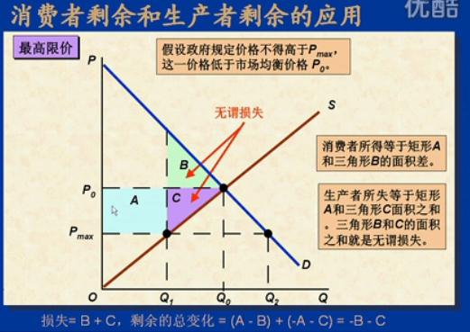 在ZF没有限制价格的情况下,假设均衡点为E,假设从P(max)出发的水平直线交供给曲线于点M,则生产者剩余为三角形OQ0E的面积,在ZF限制价格后,生产者剩余只有三角形OMQ1.于是从生产者剩余角度,生产者所失(即生产者所失去的生产者剩余)恰等于两个三角形面积之差,即A+C的面积。