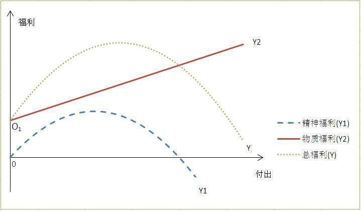 物质福利曲线Y2:就是工人幸福度与工资数量之间关系的曲线,我们假设工人付出与工资呈线性关系,于是物质福利曲线就变为幸福度与付出呈线性关系的Y2曲线。