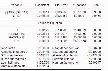 跪求大神帮助!!!!很急!!!我的毕业论文用的沪深300指数做的garch-m模型,但是结果不理想,Z统计量的概率太大,我该肿么办啊!!!!我的数据是取的05年4月8日到2012年12月4日,通过了ADF检验和自相关检验的,但是就是不能通过GARCH-M的Z检验!!!这是为毛为毛~~我都哭瞎了!!我用05年到08年的数据,发现拟合的很好,各方面的数据都能通过检验。但是05年到2012年的就不行!!!我以为是滞后期选的不对,于是我就从3试到了20 还是不行我很桑心,跪求大神帮忙~~
