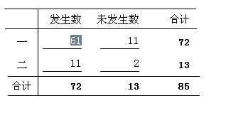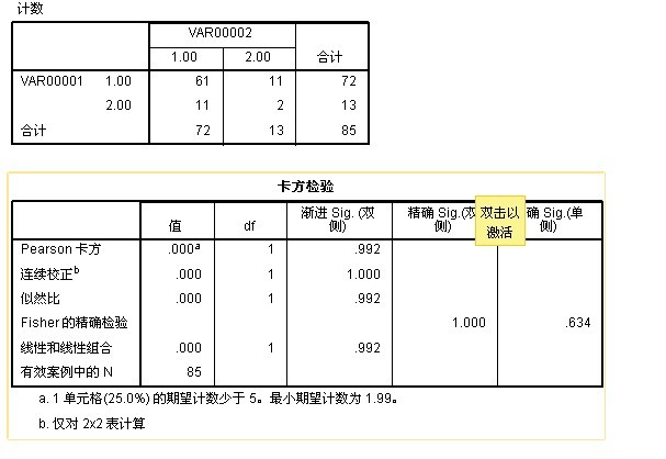 计算 出来的结果应该是看第二行,即 校正那一行,显示卡方值=0.000,P=1