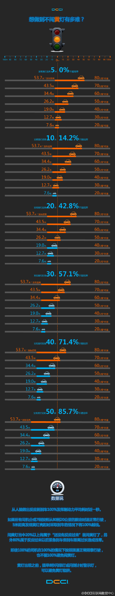数据来了,要想做到不闯黄灯到底有多难?7组司机按80到20公里限速行驶,发现黄灯踩刹车到制动力完全发挥,平均反应时间近1秒,刹车距离决定结果:离线5米时黄灯亮则100%闯灯,10米时85%...结论:乌龟不会闯黄灯,但人100%情况下照章行驶也避免不了闯灯;提前8秒预警可保安全,但有关部门说不会这么做。