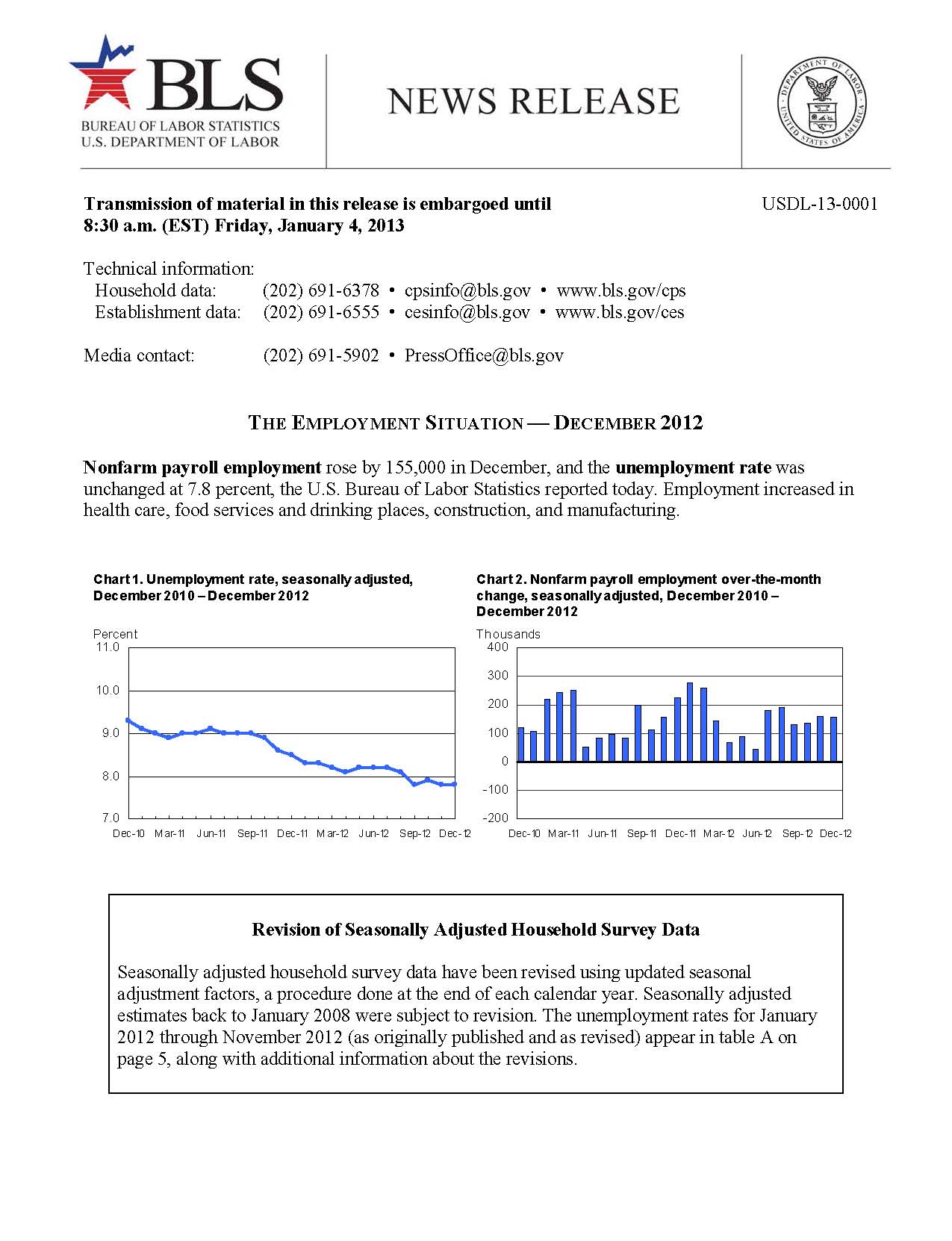 美国劳工部2013年1月4日发布的最新美国就业数据