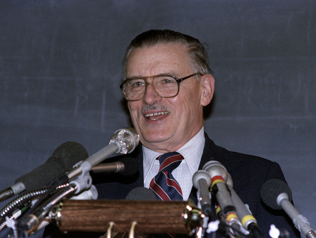 James Buchanan flashes a smile at a news conference announcing he has won the Nobel Proze in economics at George Mason University in Fairfax, Virginia, on Oct. 16, 1986. Photographer: Don Emmert/AFP via Getty Images