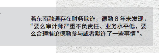 东南融通过去8年(包括上市前)都是由德勤审计的,若东南融通存在财务欺诈,德勤这么多年没有发现问题,“要么审计师严重不负责任、业务水平低,要么可以合理推论德勤参与或者默许了一些事情”。