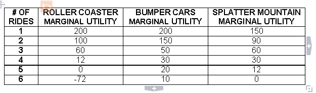 Jackson has $20, which he plans to allocate among three rides at the amusement park. Each ride on the Roller Coaster costs $4.00, on the Bumper Cars, $2.00, and on Splatter Mountain, $6.00. The Table below shows Jackson’s utility schedule for the three rides