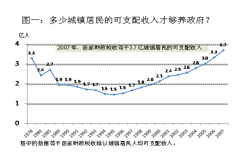 过去30年里,中国的ZF规模并非一开始就这么大。如果说“小ZF、大社会”一直是改革的理想,那么,1978-1995年间确是如此走向。改革之初的1978年,国家财政税收相当于3.3亿城镇居民的可支配收入、8.5亿农民的纯收入。那时的ZF也不小,这就是为什么要改革ZF的原因之一,但那时的ZF毕竟要负责城市人从摇篮到坟墓方方面面的生活开支,所以,ZF当然大。