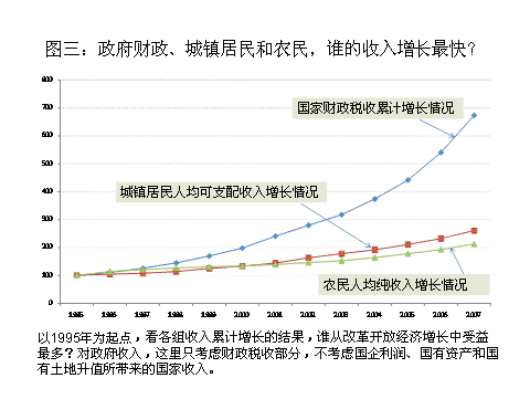 我们也可以把ZF、城镇居民、农民看成中国的三大群体。那么,在改革开放的成果中,哪个群体受益最多呢?自1995年到2007年的12年里,ZF财政税收年均增长16%(去掉通货膨胀率后),城镇居民可支配收入年均增长8%,农民的纯收入年均增长6.2%。这期间,GDP的年均增长速度为10.2%。图三给出三个群体的累计收入增长情况。