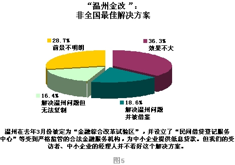但我们的调查结果显示,中小企业对“温州金改”在很大程度上并不看好。仅有18.6% 的受访者认为“可以解决温州的问题,并能成为其它地区的借鉴”(见图5)。