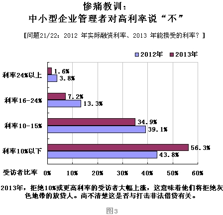 虽然对前景更加乐观,但受访者对可接受的融资利率仍然保持谨慎(见图3)。在2013年,拒绝接受10%或更高利率的受访者人数大幅上涨。这意味他们将拒绝民间融资等利率相对较高的融资渠道。但目前尚不清楚原因究竟是企业盈利前景无法支撑高利率,还是“主流”信贷机构改善与中小型企业的合作态度,抑或是对非法借贷的打击让企业高管们采取了较为谨慎的态度。