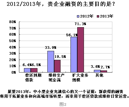 从2013年的融资期限和贷款用途两个方面的调查结果显示,受访的中小企业经理人计划大大增加长期借贷(1年期以上融资计划较2012年上升17%,达47%),7成受访者会将所融资金用于扩大业务规模或进行产业升级(见图2)。