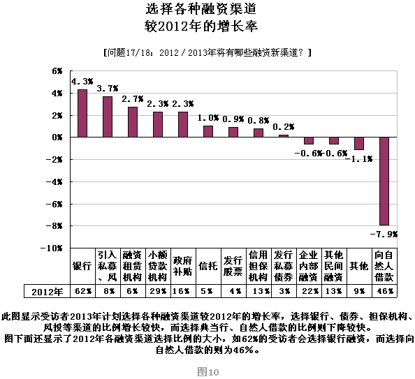 中小企业会从何处筹措资金?选择“银行”的比例遥遥领先于其他选项——三分之二的受访者预期银行会成为他们2013年的主要融资渠道。其余4个选择比例高于去年同期的融资渠道为:新三板融资,信用担保机构,引入私募或风投,发行中小企业私募债(见图10)。