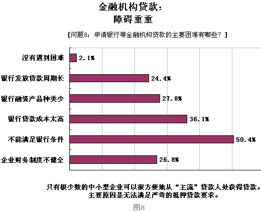 我们的数据特别指出了小型企业和企业主不得不向民间借贷求援的原因:难以获得银行贷款——仅有2.1%的中小企业在向银行等金融机构申请贷款时“没有遇到问题”(见图8)。阻碍他们的主要原因是“不能满足银行所需要的抵押物条件、获取贷款的总成本太高、金融产品不能灵活满足他们的需求,以及发放贷款的周期太长。”