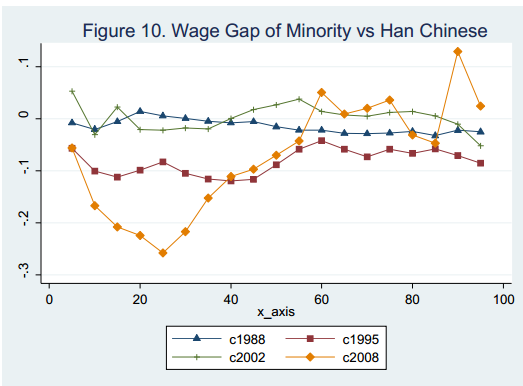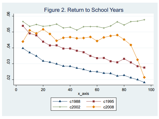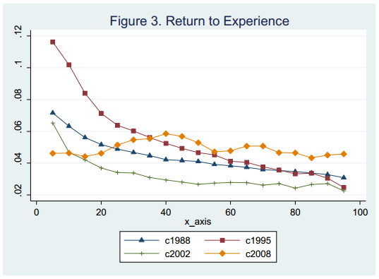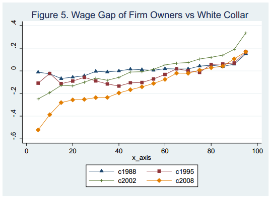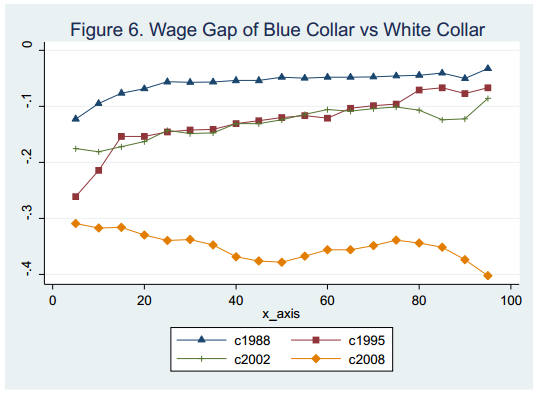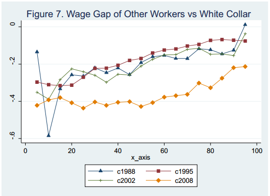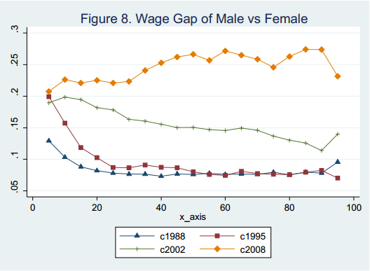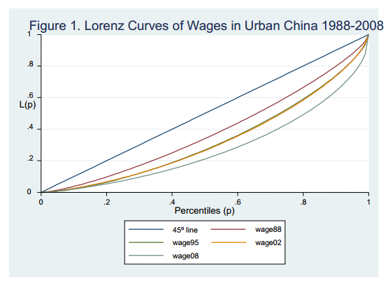 This paper examines change in wage gaps in urban China by estimating quantile regressions on CHIPS data. It applies the Machado and Mata (2005) decomposition, finding sharp increases in inequality from 1988 to 1995 and from 2002 to 2008 largely due to changes in the wage structure. The analysis reports how the returns to education and experience vary across wage quantiles, along with wage differentials by sex and party membership. The role of industrial structure, ownership reform and occupational change are also estimated. In the recent period, 2002 to 2008, falls in the returns to education and experience have been equalising. However, changes in every other category of observed wage differential – by sex, occupation, ownership, industrial sector and province – have served to widened inequality. The gender gap continued to rise, as did the gap between white collar and blue collar workers, and between manufacturing and most other industrial sectors.