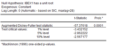 做一个关于8种国际指数的研究,一般情况下,我们对单独指数做ARMA模型时候,先对历史数据做对数差分y1=dlog(y),然后判断序列平稳性和白噪声,然后通过自相关和偏相关图定阶,但是我这个自相关和偏相关图看的不明显,怎么定阶?举个例子,我选取了西班牙指数IBEX35 从1999年1月4日到2012年1月4日共3287个数据,通过对原序列观察,发现序列不平稳,于是做对数差分,做单位根检验,图如下: