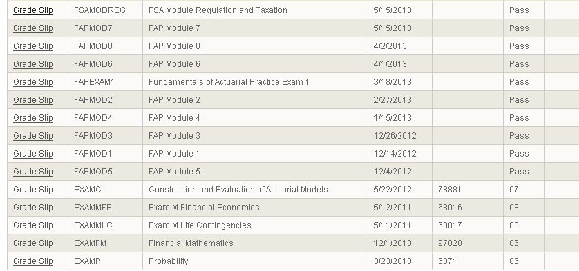 后来毕业的时候去了财产险行业, 就开始考FCAS.高级课程基本要考两次才过。尤其是最恶心的regulation那一个course,我第3次才通过,差点过了discount的次数了。后来拿到了FCAS证书之后,我回过头去考FSA,反正没几门了。2010年上半年的时候就考完了。