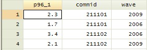 逍遥梦蝶 发表于 2013-3-22 21:47 提供一个笨办法,先把这个数据拆开,拆成一个文件有p96_1、commid、wave2009和另一个文件p96_1、commid、wa ...