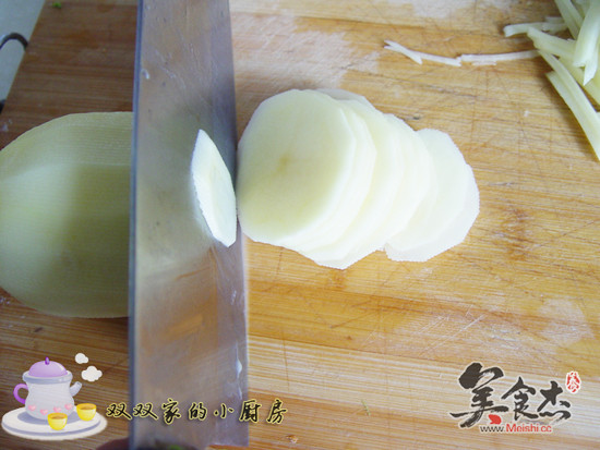 再切的时候,这个土豆片就会阻碍其他片片粘刀,顺利地落地,一片一片地摞起来,这就为以后切丝奠定了牢靠的基础。
