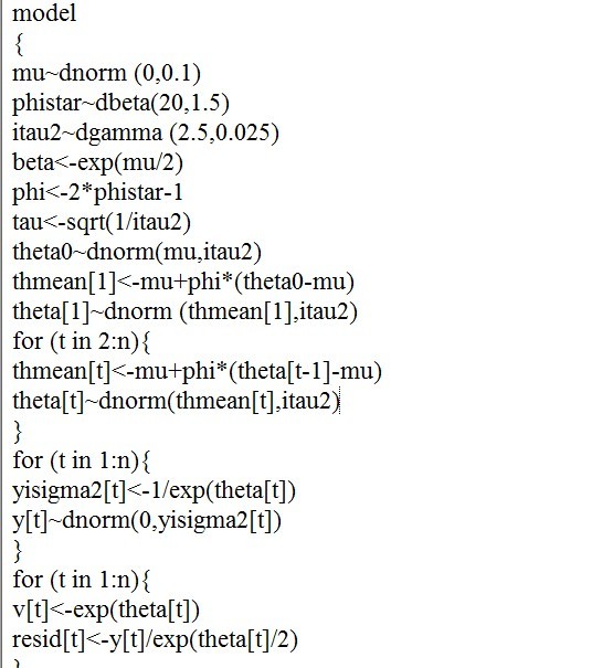 亲们,我最近在写毕业论文,刚接触WINBUGS,想用SV模型做波动率预测,在对数据进行初始化的时候总有问题,求好心人指点帮忙[img]file:///C:\Users\jindan\AppData\Local\Temp\52W[C~~FFQ[27)18U93ZOWB.gif[/img]