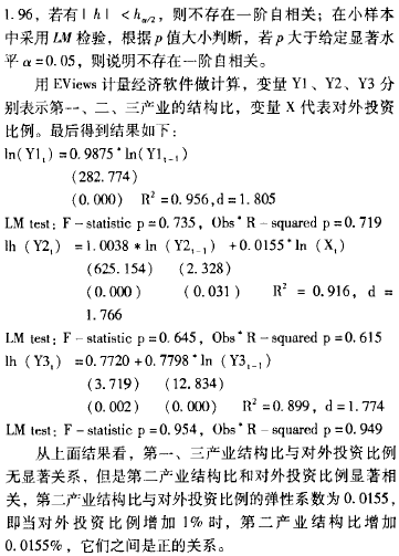 设置变量Y1 Y2分别为第一、二产业的结构比 和 X 为ODI占固定投资的比例
