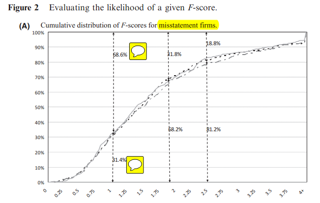 这将生成一个累积分布图,其中横轴是`fscore`,纵轴是累计百分比。绿色线表示31.4%的样本Fscore小于1,蓝色线表示68.2%的样本Fscore小于2,红色线表示81.2%的样本Fscore小于2.5。