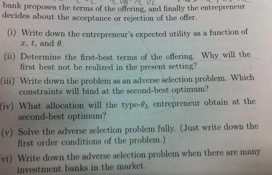题目大概的意思是一个有初始财富W的创业者拥有一个的公司,想上市。创业者的效用类型是风险趋避,一个递增的concave效用函数Ue。公司的估值为θ+ε。ε在未来实现,在交易的时候他的值对双方而言是未知的。It has a mean zero.而θ的实现只有创业者知道。θ有两种类型 θl<θh.θl出现的概率为β,θh出现的概率为(1-β)。 β*θl+(1-β)*θh>1是common knowledge。
