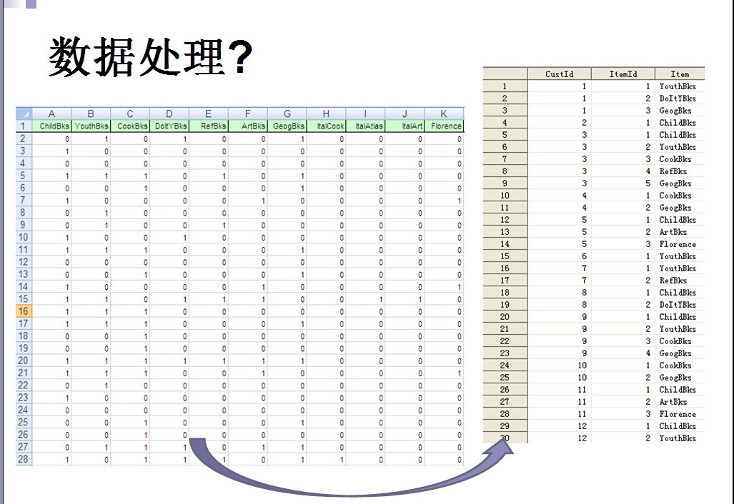 yddd726 发表于 2013-4-22 13:25 是这样的。左侧的每一行代表一个消费者购买的书目,有则为1,无则为0 然后右侧的custid表示消费者的编号 ...