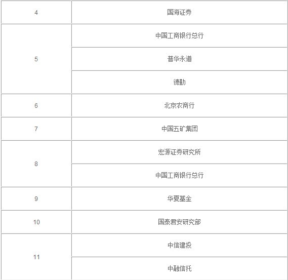 中国工商银行总行 4个    中信银行总行     1个 上海银行总行     1个   中国五矿         1个 工银亚洲(香港) 1个     香港对冲基金     1个