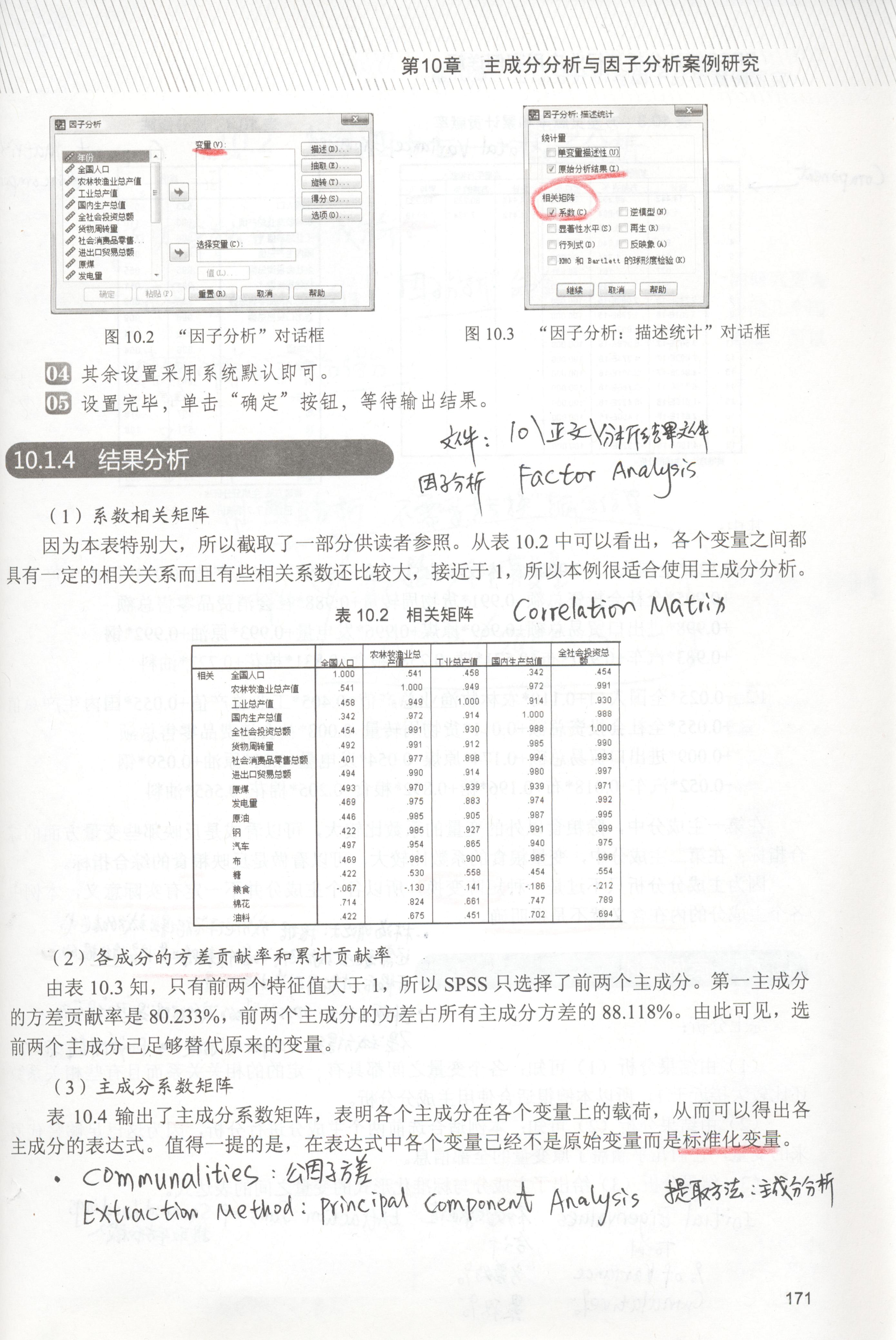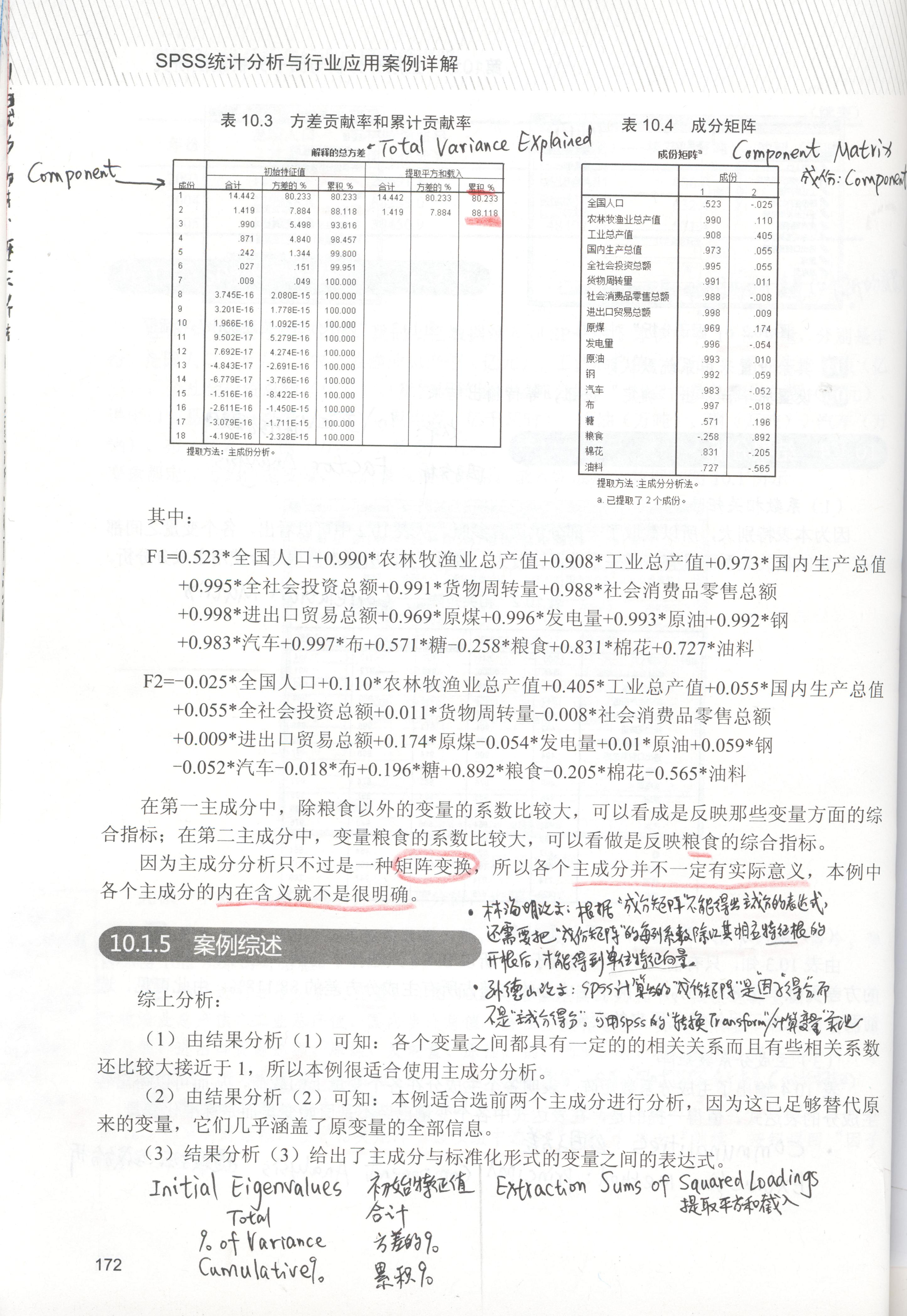 第172页修正了SPSS软件的主成分错误:(1)SPSS没有专门的“主成分分析”按钮,使用的是“分析-降维-因子分析”命令。因此,SPSS软件计算结果是“因子得分”,不是“主成分得分”。(2)因此,需要把“成分矩阵”的每列系数除以其相应特征根的开根后,才能得到单位特征向量,即主成分得分。(3)具体可以用SPSS的“转换Transform-计算变量”命令实现。