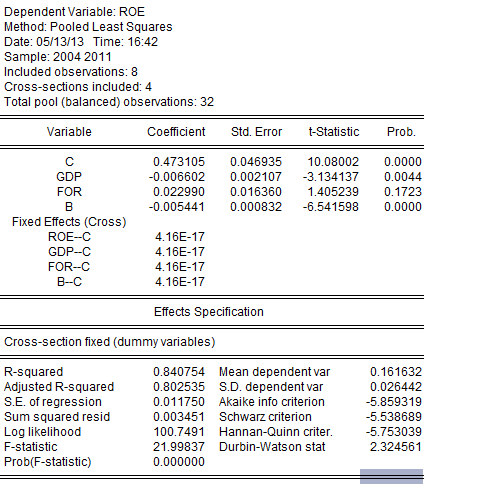 我在做一个关于外资银行进入我国对本土银行盈利性的实证检验,因为太久没碰eviews了,而且当时学得也不深入,所以基本上不太会操作了,所以基本跟一个新手差不多~我用的模型在图里面,ROE是被解释变量,GDP,B,FOR都是解释变量,workfile是在balanced panel里面新建的,然后导入了数据之后,我在new object里面新建了个pool,然后把workfile的变量导入到pool里面之后按了estimate,cross-section里面选了fixed和none的结果都在图里面,问题是:1.我应该用fixed还是none的结果啊?怎么解释这些结果啊?