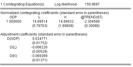 这样协整方程是不是GDP+14.895L+14.846K-2.3046=0?