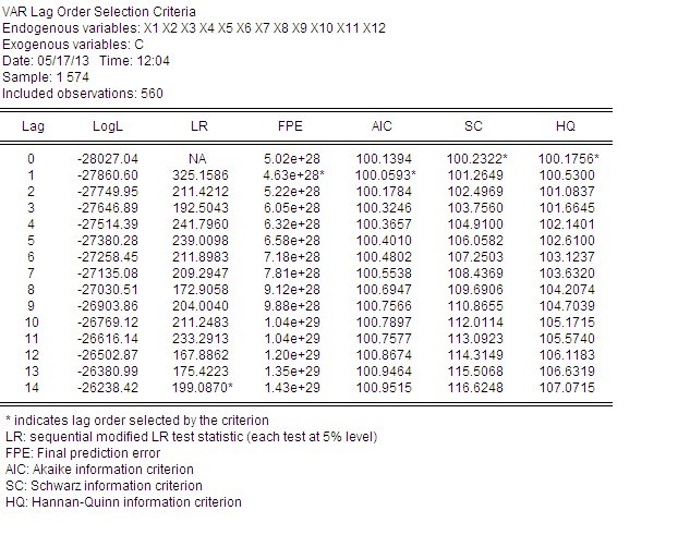 大家帮忙看看,我之前取的事股指的对数收益(先对数再差分),但是通过VAR-view-lag structure-显示出滞后阶数都显示0阶,想做格兰杰 脉冲响应的,这明显没法做啊,然后我直接对原始数据做差分,得出的结果如下:大家帮帮忙,分析分析,到底问题出在哪?数据应该不少啊!!1