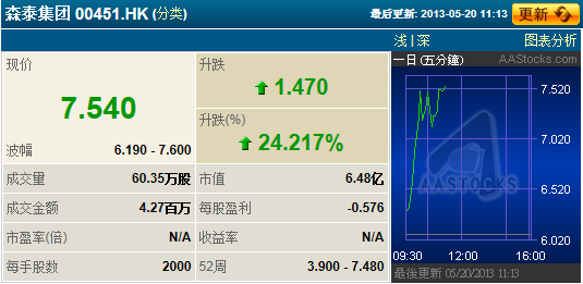 2013-05-20 10:02:44 传保利协鑫(03800.HK)母企拟借壳森泰(00451.HK)上市