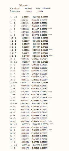 proc anova data=b6;class age_group1;model fe=age_group1;means age_group1/cldiff t;run;