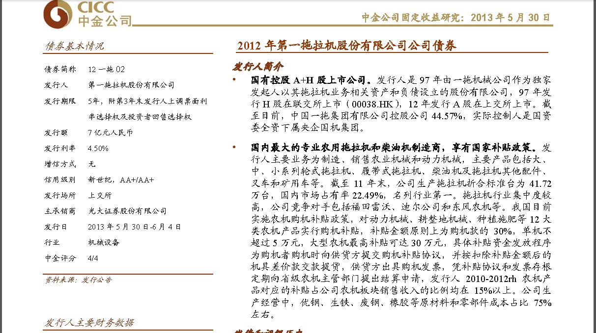 通控股担保后,债项评分提升至3-;一拖是享有ZF补贴,盈利和现金流较为稳定的国有企业,债务负担轻,流