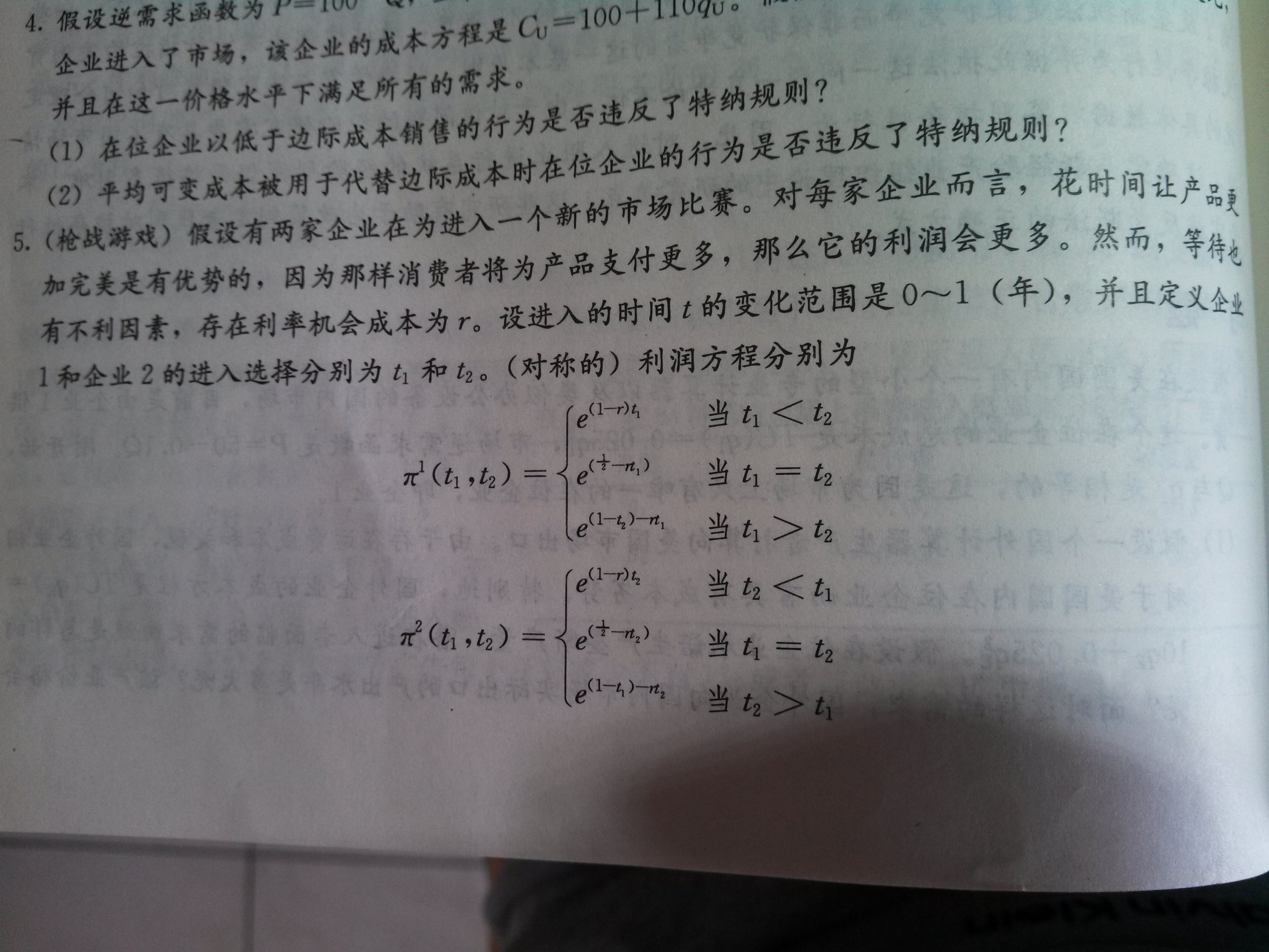 做派波尔的《当代产业组织理论》5e 第9章——进入阻止与掠夺——第5题时,没有头绪,有哪位仁兄帮忙看看……在下谢过
