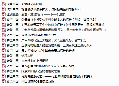 2013高华证券:一共16篇, 内容涉及网购、新能源、移动互联网、营改增、广告营销、城镇化、消费品等诸多行业,有两篇论坛已有,没法上传。