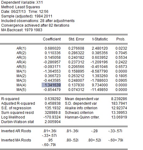 我用eviews做的参数分析,结果MA(1)和MA(4)两者洗漱参数都很好,该选择哪一个呢?
