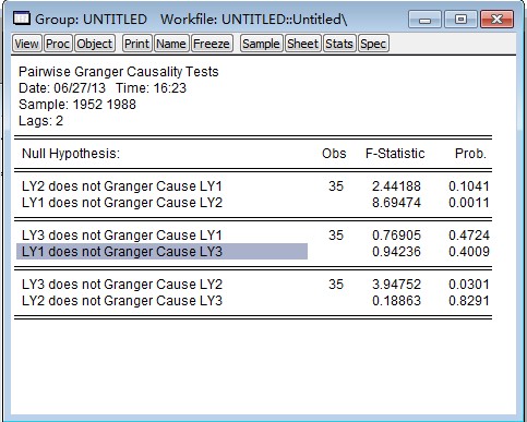 如题:易丹辉教材第八章的8.2图是怎么得出来的?求具体操作步骤……我是将ly1,ly2,ly3三个变量打开为一个group,然后点选VIEW/GRANGER CAUSALITY TEST,这样的操作步骤来的,但是得出来的结果与教材完全不一样……我的是这样子的结果