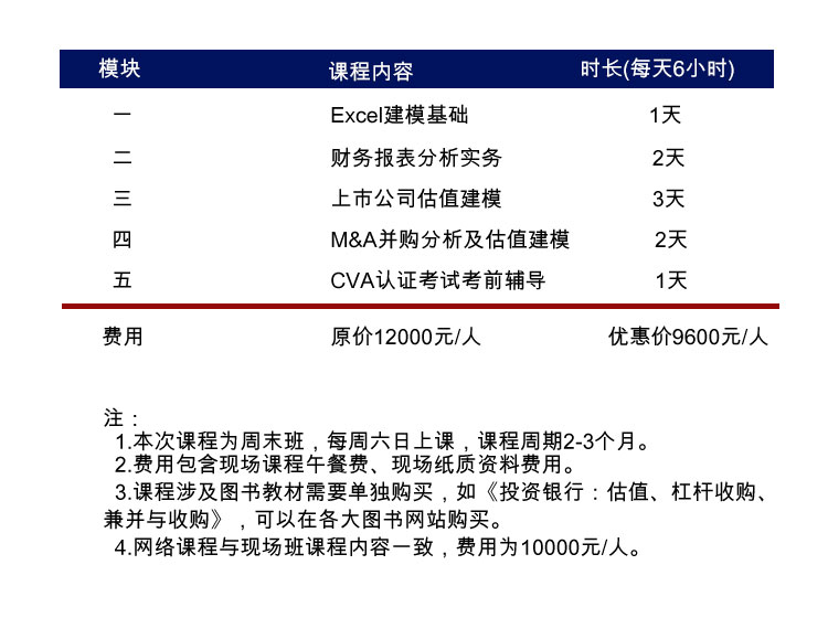 通过高效的课程学习+模型实践操练,您将完全掌握投资银行、私募股权、财务顾问、实业集团投资工作岗位中的估值建模能力和工作技巧,熟悉并掌握如何撰写一份行业研究报告。