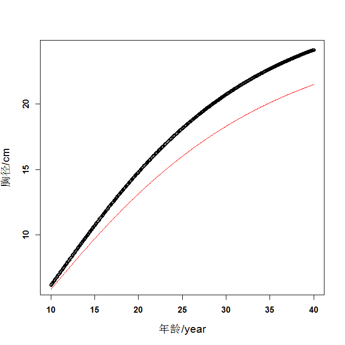 plot(y1~x,col = "black",xlab="年龄/year",ylab="胸径/cm",cex.lab=1.3,font=2)