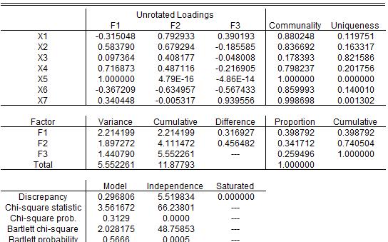 这是我用另一组数据做的因子分析结果:是不是那个cumulative指的就是累计方差贡献率啊,0.398792、0.740504、1,意思是不是因子F1的方差贡献率为0.398792,然后F1加F2的累计方差贡献率为0.740504,F1加F2加F3的累计方差贡献率为1?