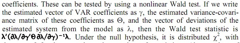 如题,我要对VAR模型的参数进行Wald检验,后附图。想知道wald检验统计量是什么。其实英文勉强能看懂,不过wald检验一窍不通,所以一知半解。请高人指点:
